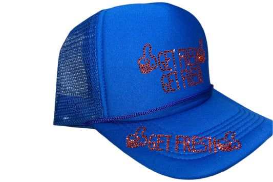 Blue GET FRESH OR GET LOST Hat With Orange Rhinestone Embroidery