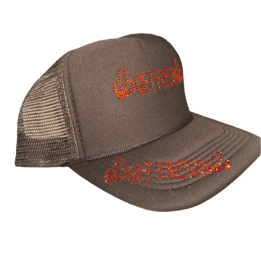 Brown GET FRESH OR GET LOST Hat With Orange Rhinestone Embroidery