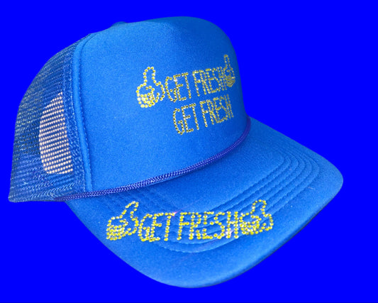 Blue GET FRESH OR GET LOST Hat With Yellow Rhinestone Embroidery