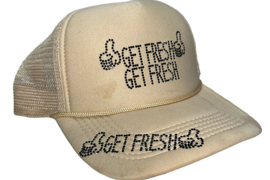 Cream and Black GET FRESH OR GET LOST Hat With Black and Yellow Rhinestone Embroidery